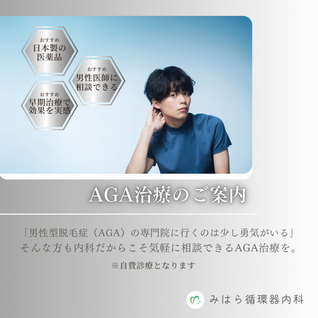 当院では男性型脱毛症(AGA)治療も行っております。薄毛の初期対策は早めが肝心です。費用や期間についても丁寧にご説明し、無理のない治療をご提案いたします。